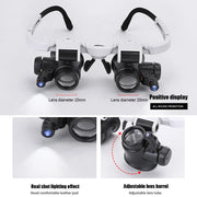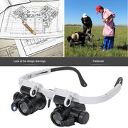 Telescopic Magnifier Glasses Loupes with 2 LED Light Portable 8X/15X/23X Lens Observation Magnifying Eyewear for Reading Jewelers Watchmaker Repair Wearing Feature: 1. Three magnifications: 8X, 15X, 23X, suitable for different needs. 2. Equipped with two LED lights, the lamp head can be adjusted. 3. The lens barrel can be adjusted to ensure comfortable wearing.
